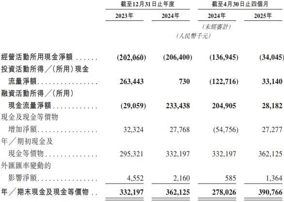 截至2023年及2024年12月31日止年度以及截至2025年4月30日止四个月,劲方医药经营活动所用现金净额为人民币202.1百万元、人民币206.4百万元及人民币34.0百万元。