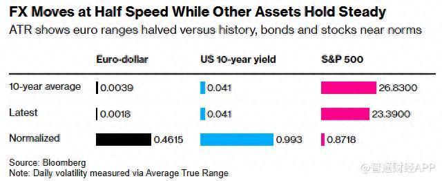 这种平静在多个方面都有所体现。欧元的日内波动幅度不到长期正常水平的一半,而美国国债收益率的波动则几乎完全符合其历史规律。Bloomberg的市场影响监测器还显示,近期外汇市场对重大经济数据的反应比美国国债市场更为平淡。